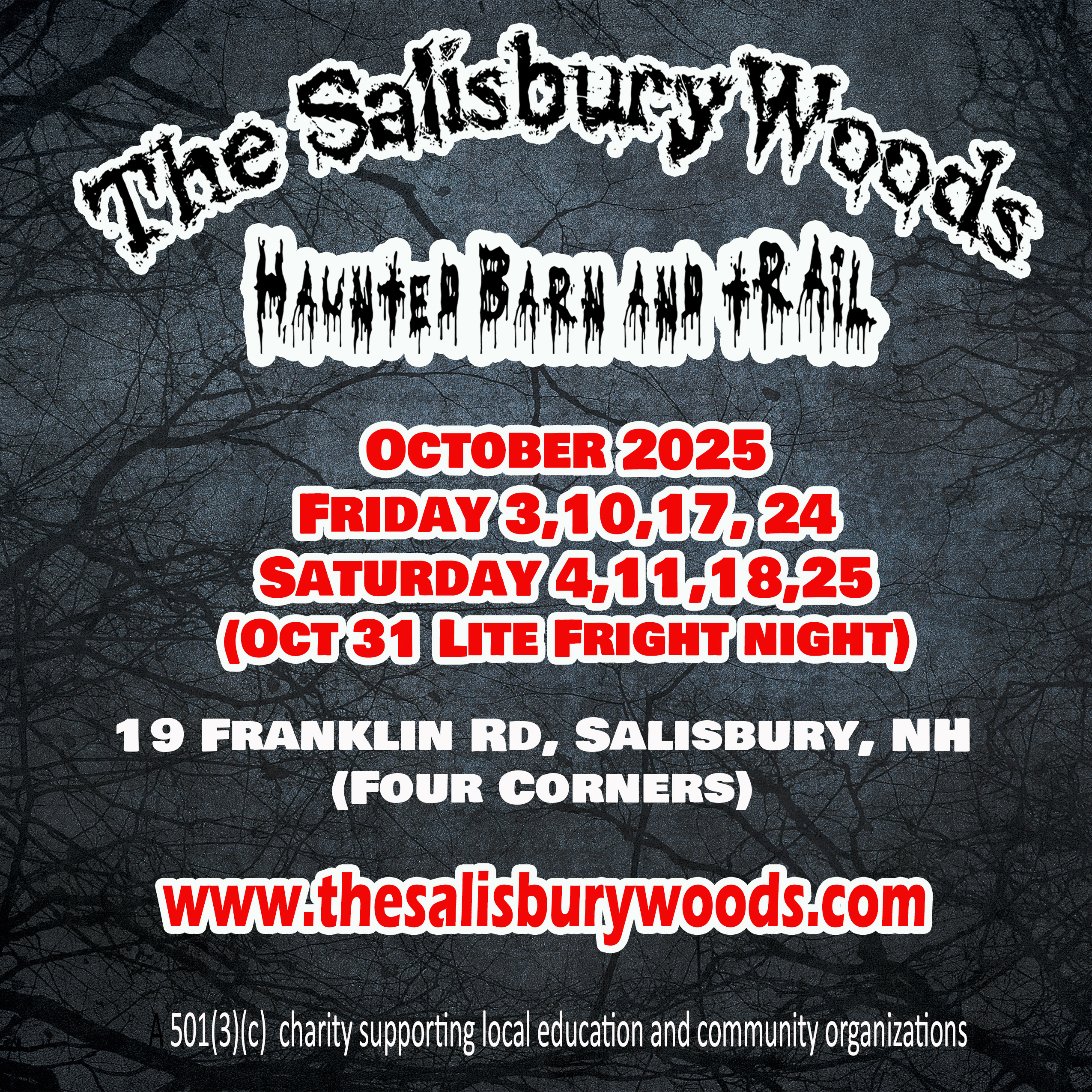 The Salisbury Woods is not for the faint of heart. As you venture through their haunted trails, you’ll encounter spine-chilling scenes and terrifying creatures that will make your blood run cold. The Salisbury Woods Haunted Barn and Trail, is a charity haunted attraction located in central NH, in picturesque Salisbury at 19 Franklin Road, at the four corners and is open every Friday and Saturday, October 3-25 with a special 'Lite Fright Night' on Halloween, October 31st.